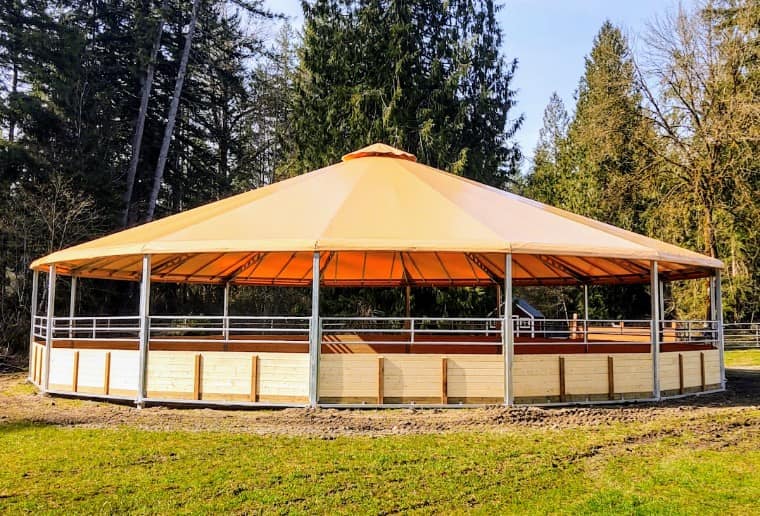 ” Our boarders love it and it’s been getting high marks from everyone coming to our competitions also. Just last week we had 25+ mph winds and the structure and top were rock-solid – never spooked a horse with noise “